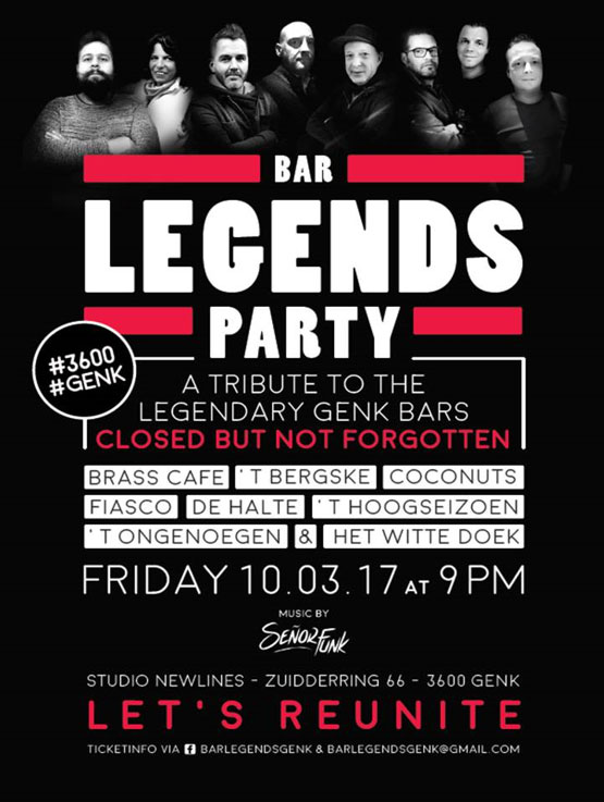 Barlegends staat voor een partyconcept waar we terug mijmeren naar de goede oude tijd waar we vaak op café gingen in het Genkse met de goede oude muziek van toen. De 1e editie van Barlegends vond plaats in maart 2017 in het magazijn van Studio New Lines in Genk Zuid en was na 1 maand meteen met 600 aanwezigen waarschijnlijk de snelst uitverkochtste party in de Genkse party geschiedenis.